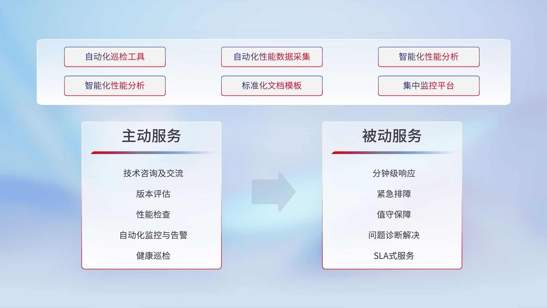 智能化工具和标准化文档,,,保障服务质量,,提供主动服务(包含技术咨询、、、、版本评估、、、性能检查、、、自动化监控与告警、、健康巡检)和被动服务包含(分钟级响应、、、、紧急排障、、值守保障、、、问题诊断解决、、SLA服务)。。。